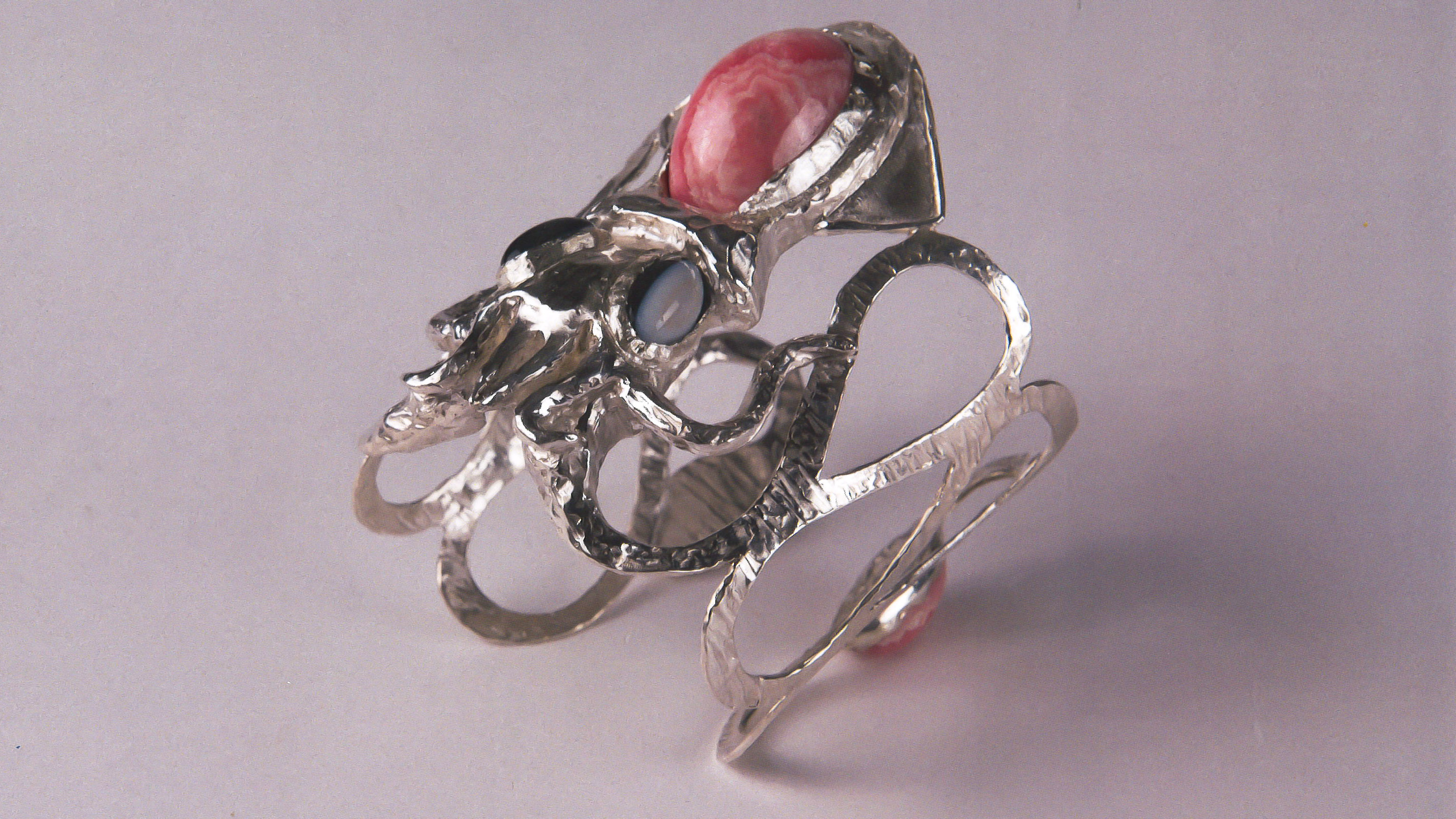 The work used materials such as silver and precious stones. The undulating and slightly polished texture of this work symbolizes the connection with the sea. The octopus also has two powerful tentacles that have the function of holding the bracelet on the hand. The wearer of the bracelet can easily fix the octopus to their arm and easily change the shape of the tentacles.