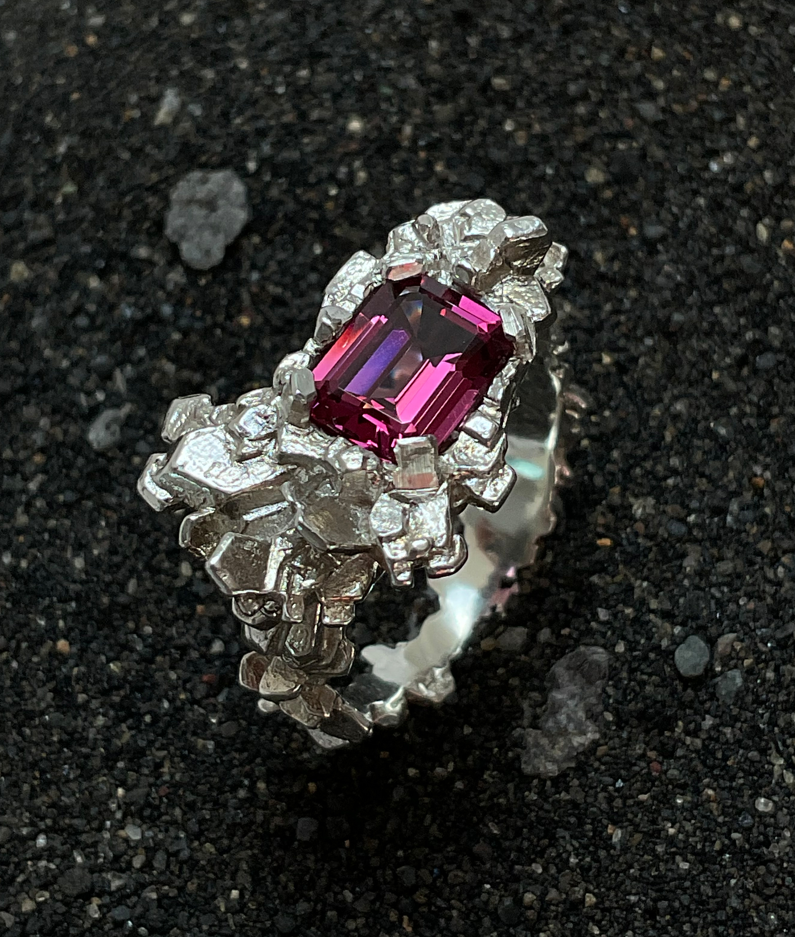 The finished ring was cast in silver and has a beautiful garnet in the center. I bought the stone from the Schütt company in Pforzheim, which is very committed to sustainability and only uses stones from existing resources. In this way, they stand for the protection of people and nature.